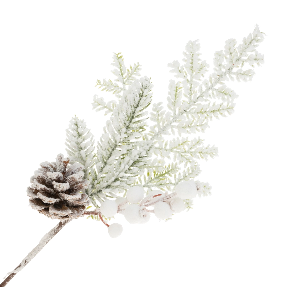 Ветка искусственная еловая заснеженная с ягодами и шишками (пластик), H41 см Зеленый