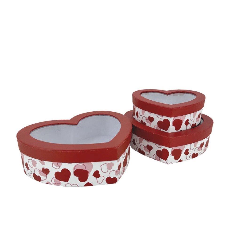 Коробка подарочная "Сердце", 22x18,5xH6,5 см - 15,5x14xH5 см, набор (3 шт), с окном Белый-красный
