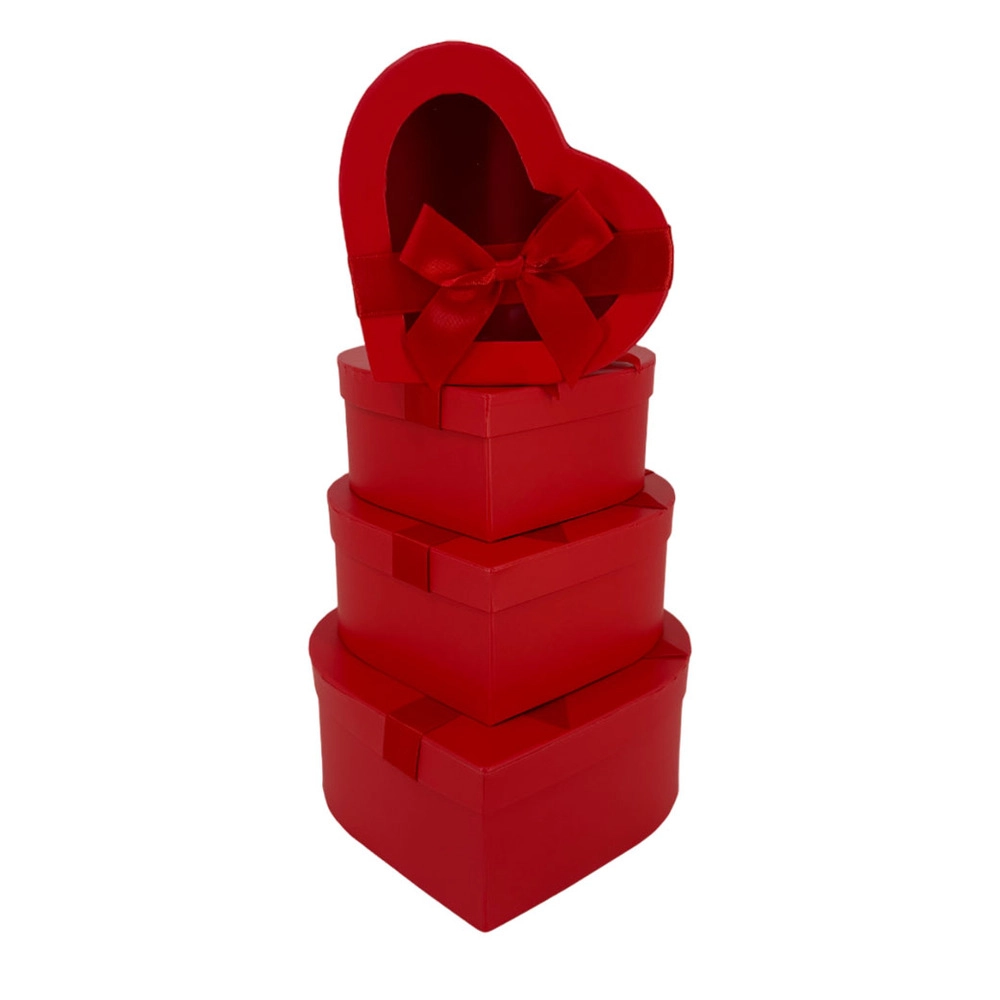 Коробка подарочная "Сердце с бантом", 21x19xH9 см - 15,5x14xH5,5 см, набор (4 шт), с окном Красный